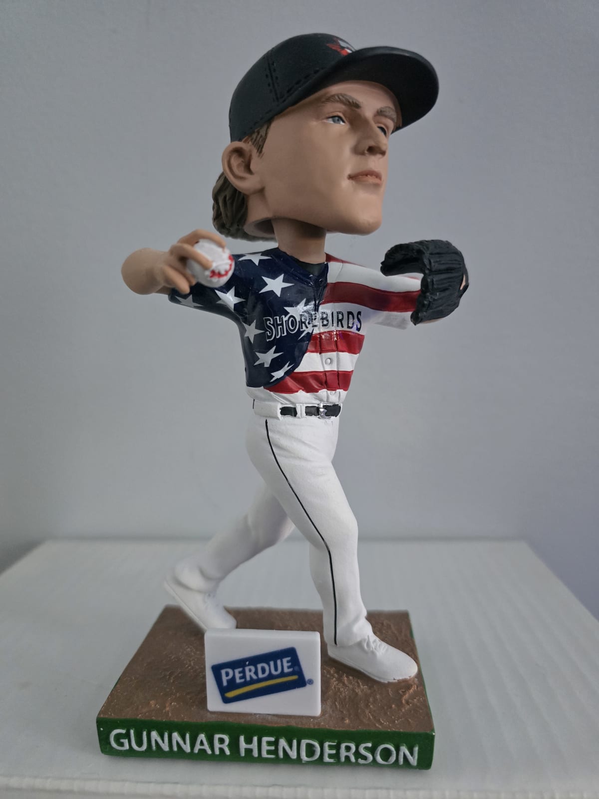 The Gunnar Henderson Stars & Stripes Bobblehead was a stadium giveaway by the Delmarva Shorebirds on July 5th 2024
